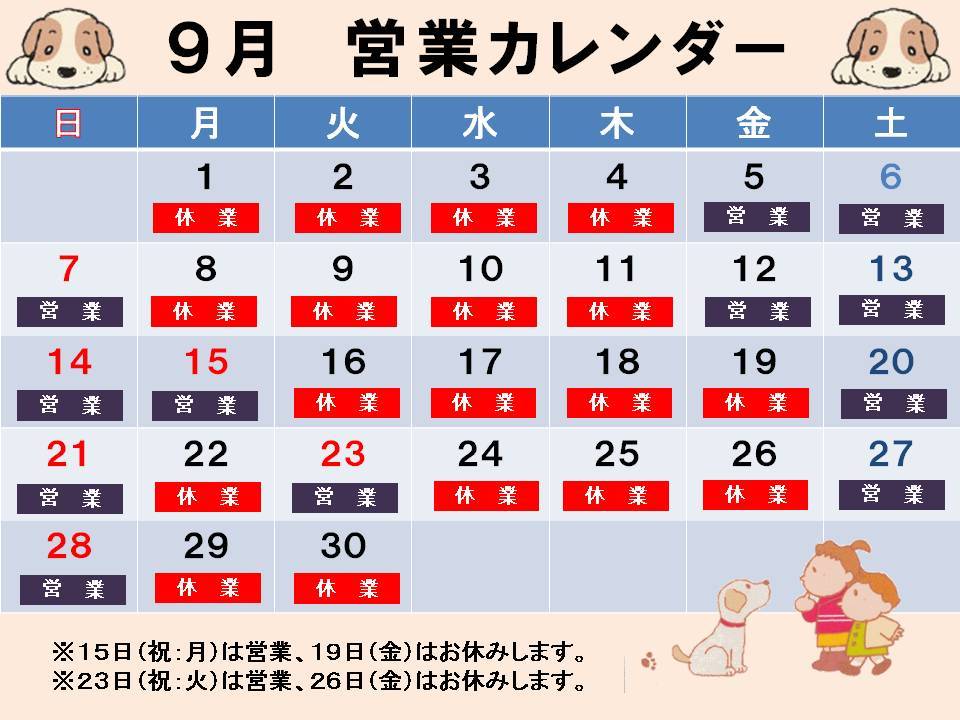 9月の営業カレンダーです。