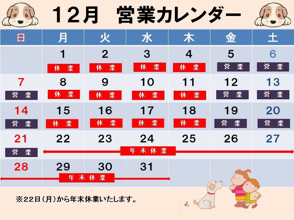 12月の営業カレンダーです。